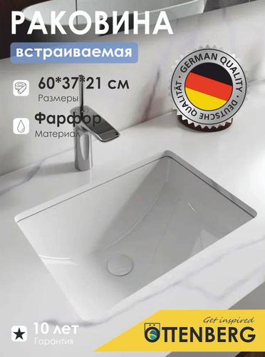 Раковина нижнего монтажа белая прямоугольная Ottenberg, 60х38х18см