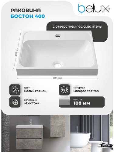 Раковина Бостон 400 белая, в ванную, на тумбу 40 см, искусственный мрамор
