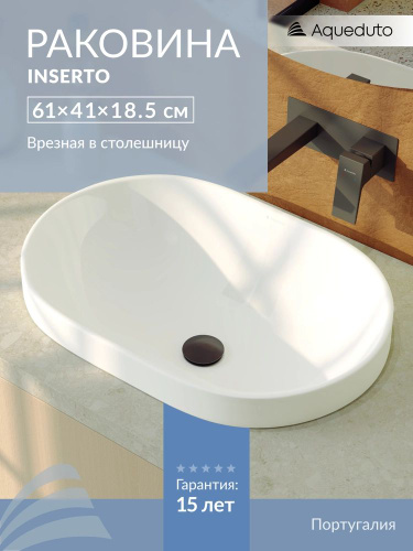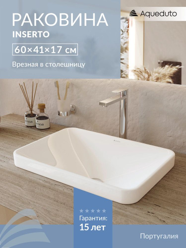 Раковина встраиваемая сверху Aqueduto Inserto INS0210 полувстраиваемая, без отверстия под смеситель, фарфоровая, раковина для ванной, белая, глянцевая, прямоугольная, со встроенным сливом-переливом