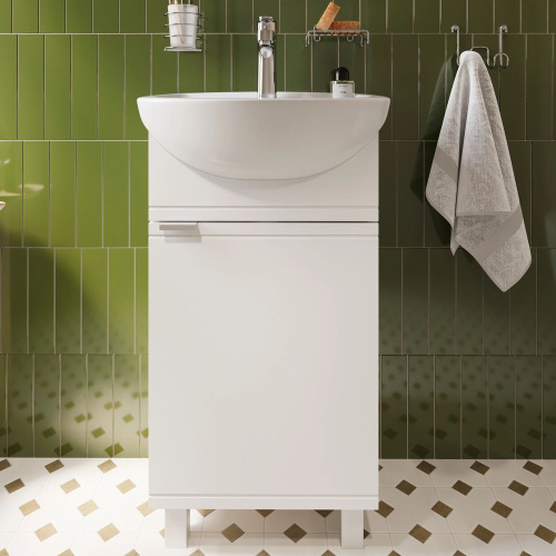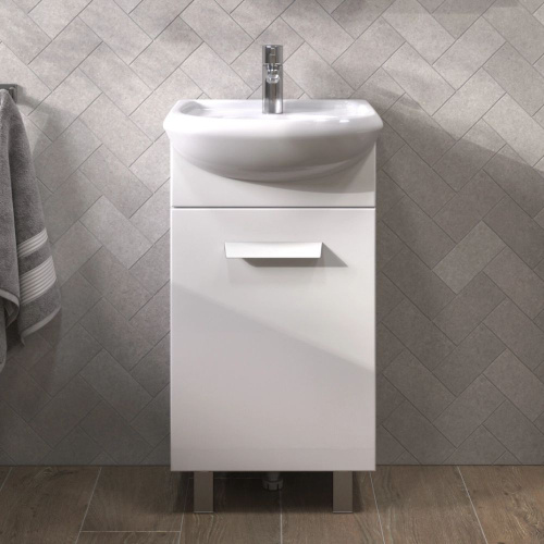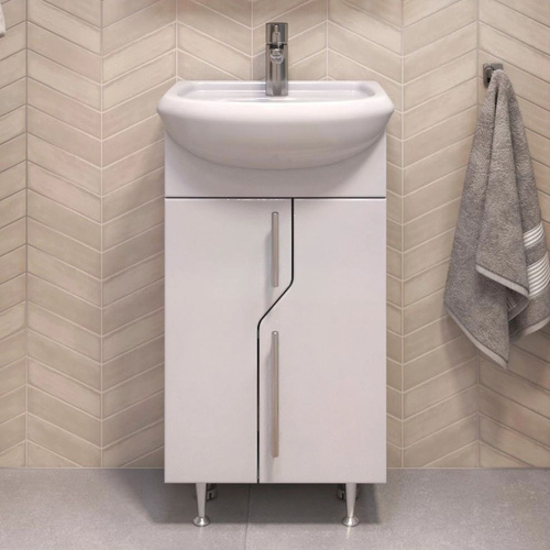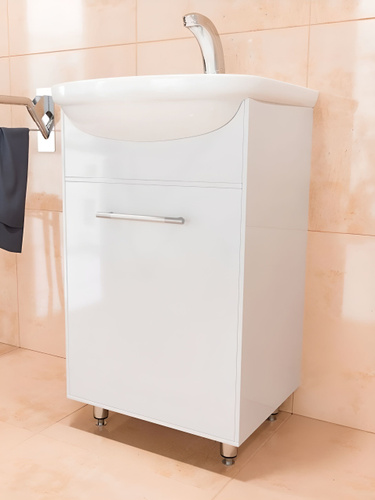 Тумба с раковиной Vigo Hoska 45 напольная, 46 см, белая, глянцевая, с дверками, раковина для ванной, фаянсовая, полукруглая, встроенный слив-перелив