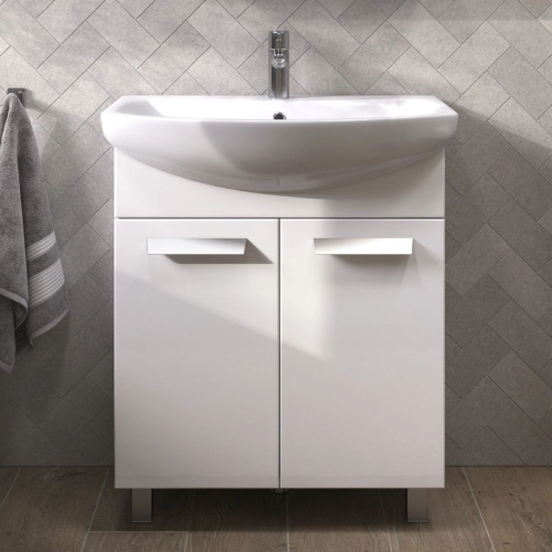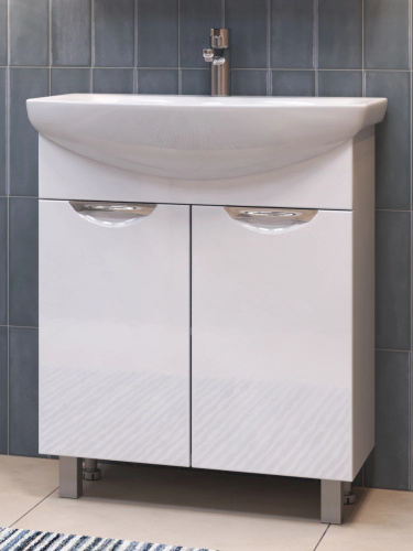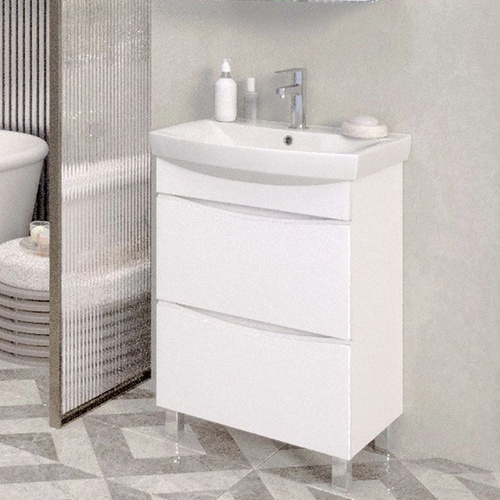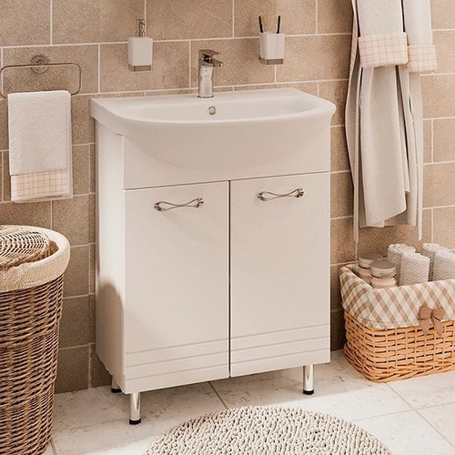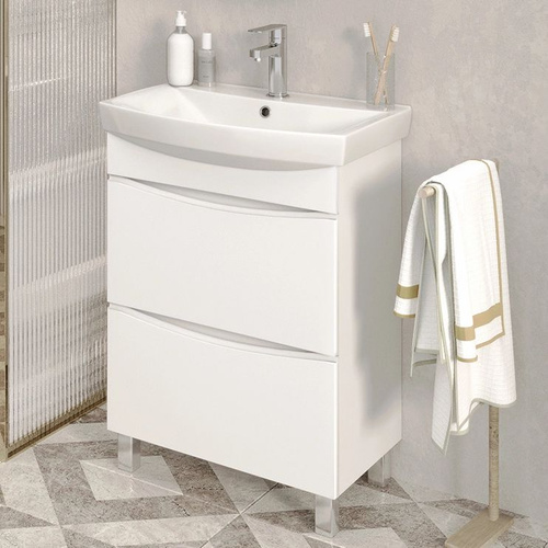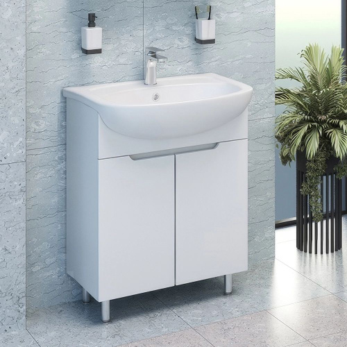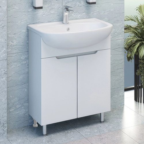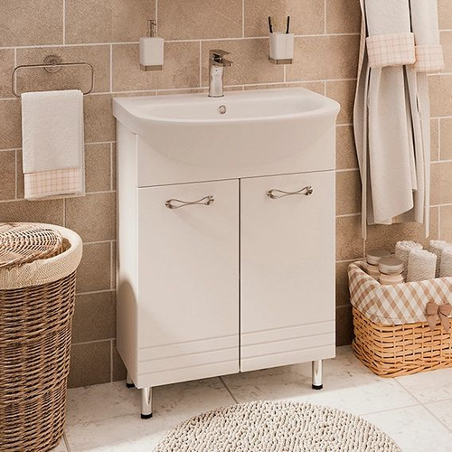 Тумба с раковиной Emmy Рио 60 напольная, 61, 5 см, белая, глянцевая, из МДФ, с дверками, раковина для ванной, фаянсовая, полукруглая встроенный слив-перелив