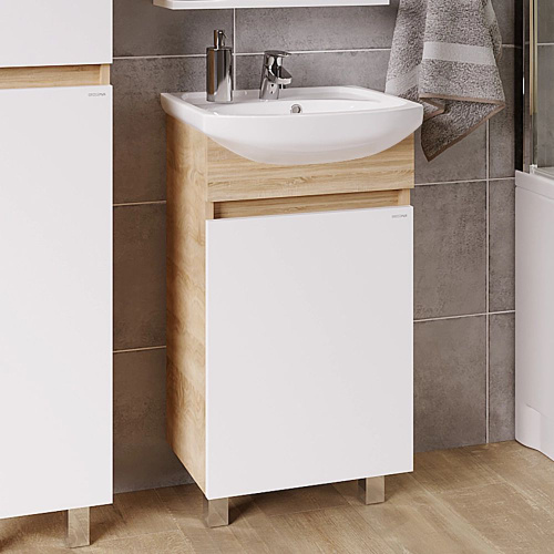 Тумба с раковиной Grossman Поло 45 напольная, 46 см, белая, светлое дерево, матовая, глянцевая, из ЛДСП, с дверками, раковина для ванной, фаянсовая полукруглая встроенный слив-перелив