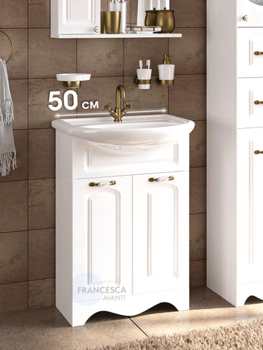 Тумба с раковиной напольная Империя 50 см, с подсветкой, белая, глянцевая, 2 двери, раковина фарфоровая, полукруглая