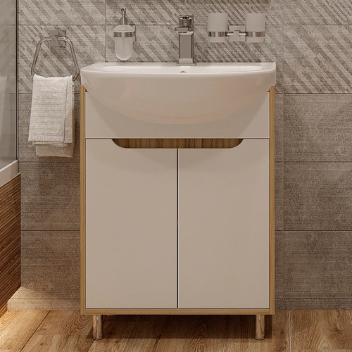 Тумба с раковиной DIWO Углич 60 напольная, 61, 5 см, белая, светлое дерево, глянцевая, из МДФ, с дверками, раковина для ванной, фаянсовая полукруглая встроенный слив-перелив с сифоном