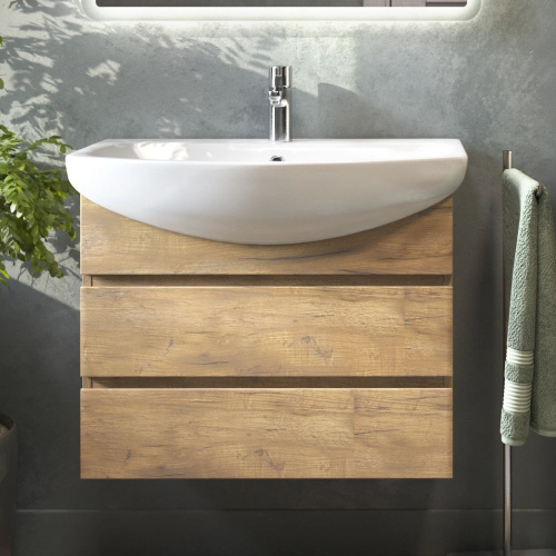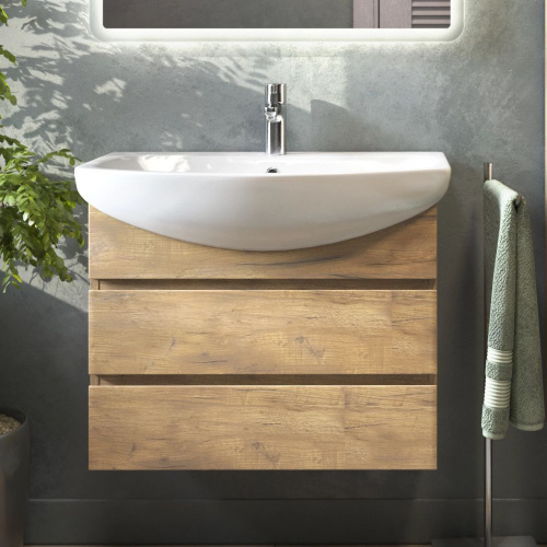 Тумба с раковиной Vigo Wing 70 подвесная, 71,5 см, светлое дерево, матовая, из ЛДСП, с ящиками, раковина для ванной, фарфоровая, полукруглая с сифоном