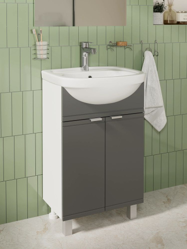 Тумба с раковиной DIWO Дмитров 50 напольная, 51 см, серая, матовая, с дверками, раковина для ванной, фарфоровая, полукруглая, встроенный слив-перелив