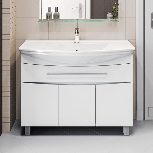Тумба с раковиной 1MarKa Lina 105Н напольная, 105,5 см, белая, глянцевая, из МДФ, с ящиками, с дверками, раковина для ванной, фаянсовая полукруглая встроенный слив-перелив