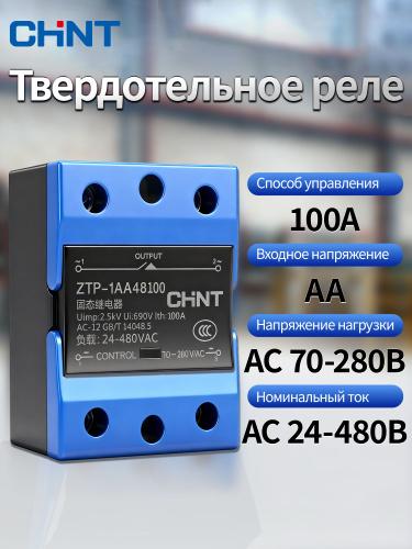 CHINT ZTP-1AA Твердотельное реле переменный-переменный ток AA контроль AA однофазное SSR,Номинальный ток 100A,Входное напряжение 70-280B AC,Напряжение нагрузки 24-480B AC