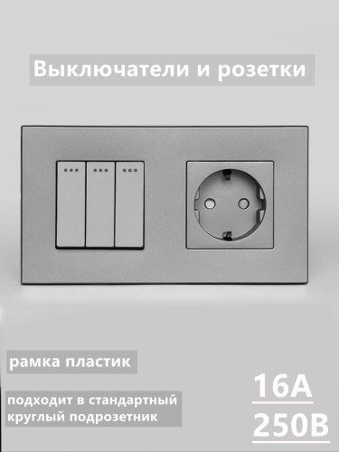 Выключатель Трехкнопочный с розеткой с заземлением, 16A 250V, серый рамка пластик