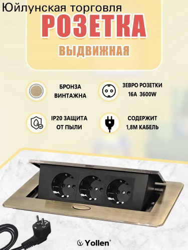 Розетка выдвижная врезная на 3 розетки с заземлением для столешницы Скрытая, для кухни и стола