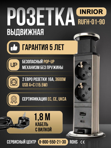 Встраиваемая выдвижная розетка для столешницы, Dori 3 розетки + USB-A+ USB-C, выдвижной вертикальный