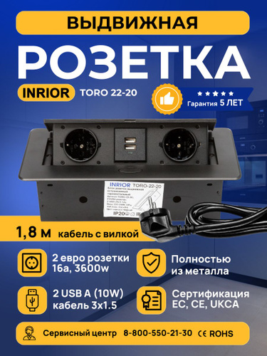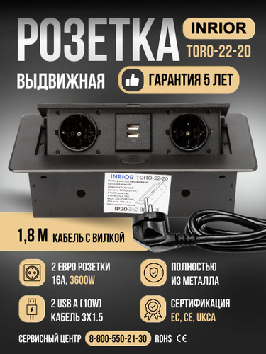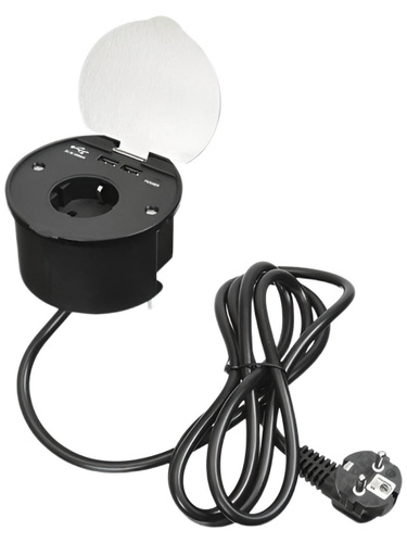 Выдвижная встраиваемая розетка, Etersso Toro Black на 2 розетки и 2 USB с кабелем 1.8 м с вилкой, черная