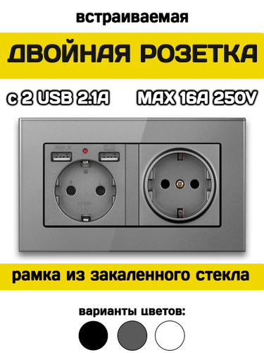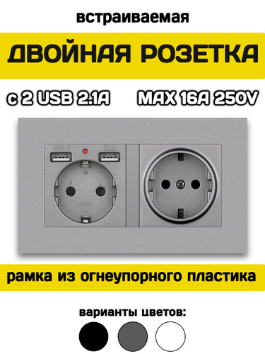 Розетка двойная встраиваемая с USB и заземлением серая