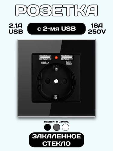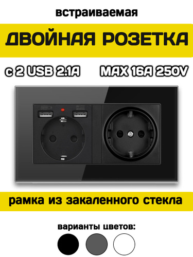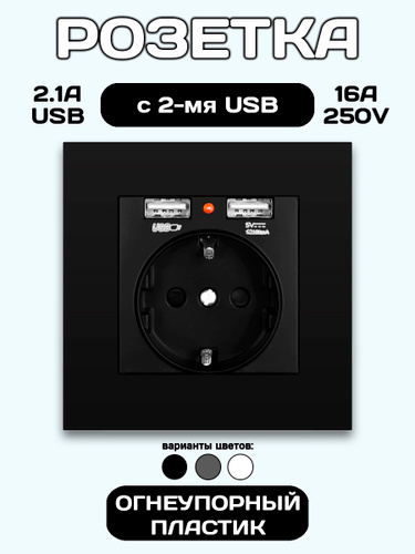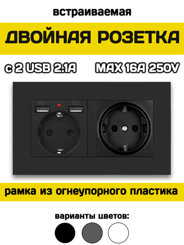 Розетка встраиваемая с USB и заземлением черная