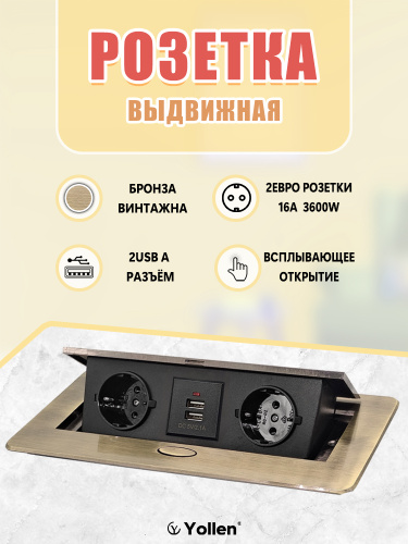 Выдвижная розетка в столешницу, горизонтальная, бронза винтажна, 2EUR 2USB socket