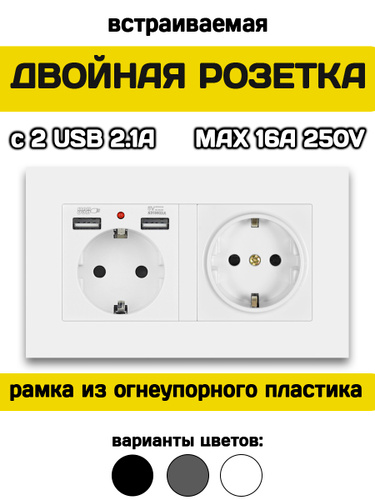 Розетка двойная встраиваемая с USB и заземлением белая