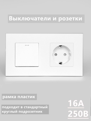 Выключатель Однокнопочный с розеткой с заземлением, 16A 250V, белая рамка пластик