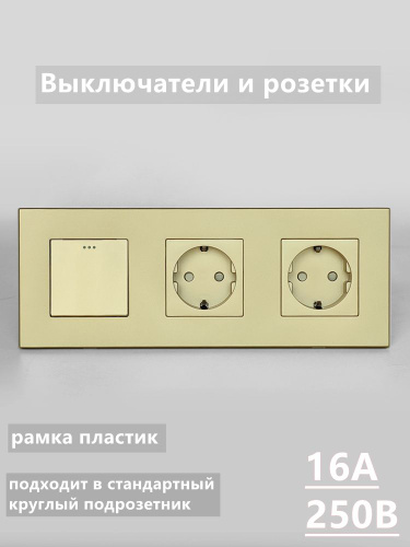 Выключатель Однокнопочный с двойная розеткой с заземлением, 16A 250V, золотой рамка пластик