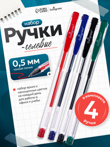 Набор гелевых ручек, 4 цвета, прозрачный корпус, синий, красный, чёрный, зелёный