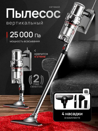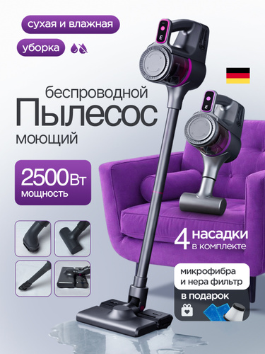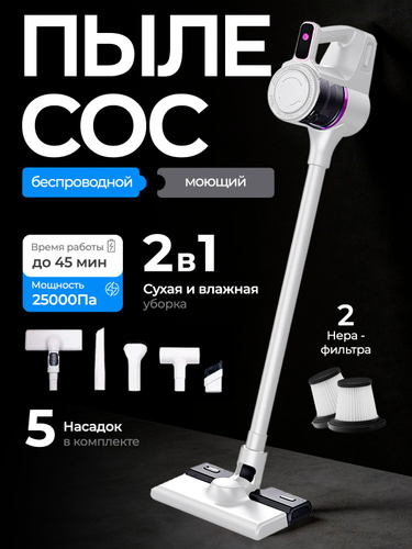 Пылесос вертикальный беспроводной моющий 2в1 для сухой и влажной уборки, 2 НЕРА фильтра + 4 насадки, 25000 Па