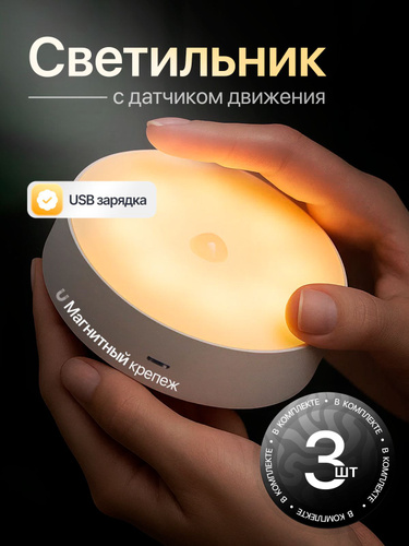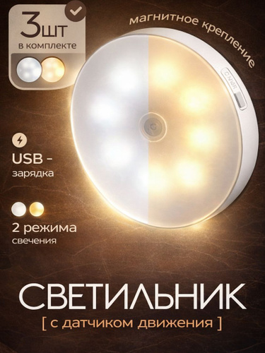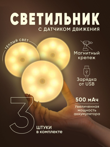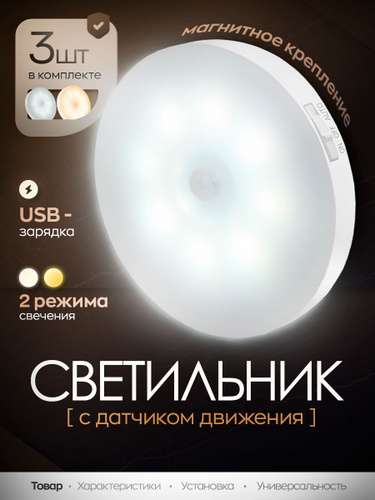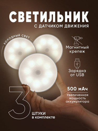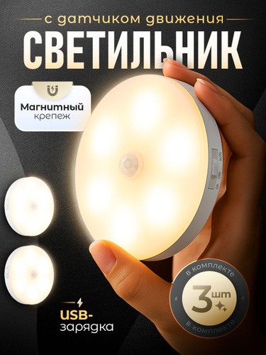 Светильник с датчиком движения беспроводной светодиодный на магнитном креплении, настенный, потолочный, лампа на аккумуляторе, 6000К, 3 шт