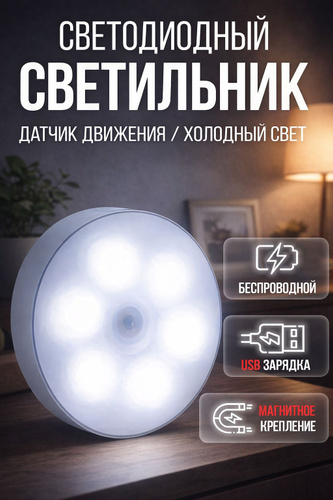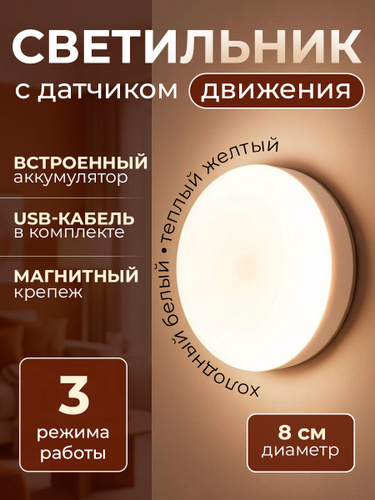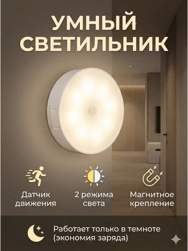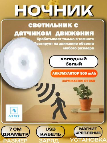 10WRM Ночник светильник с датчиком движения светодиодный беспроводной настенный потолочный в шкаф детский