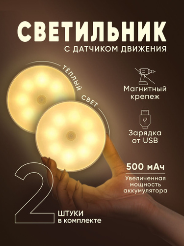 Светильник с датчиком движения, беспроводной, аккумуляторный, комплект 2шт.