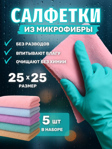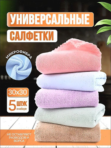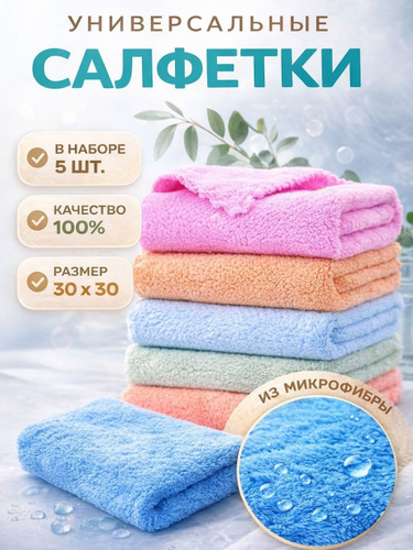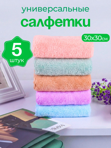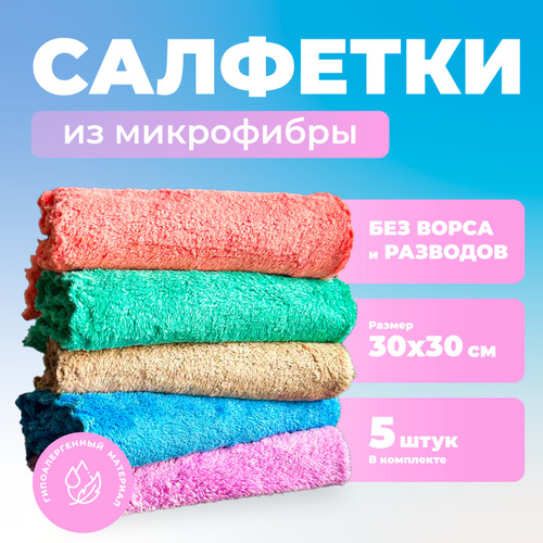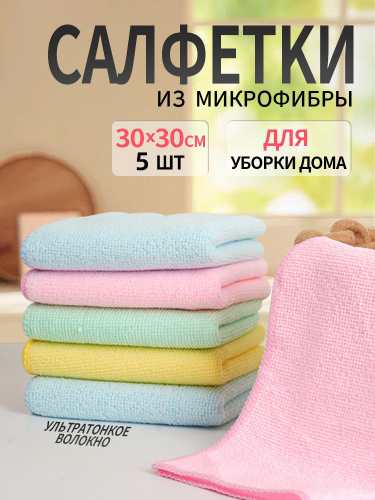 Салфетки для уборки, тряпки для уборки из микрофибры, разноцветные, 30х30 см, 5 шт.