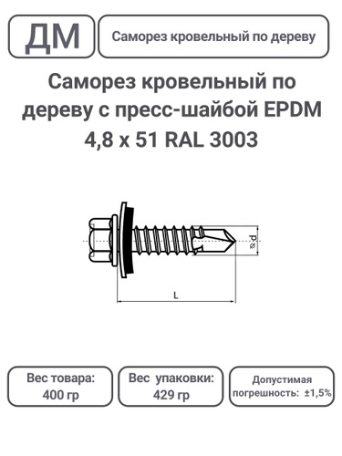 Саморез кровельный по дереву с пресс-шайбой EPDM RAL 3003 рубиново-красный