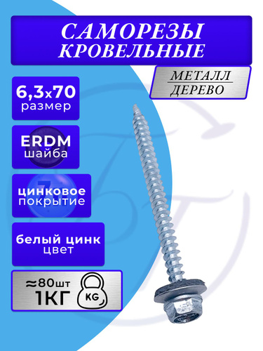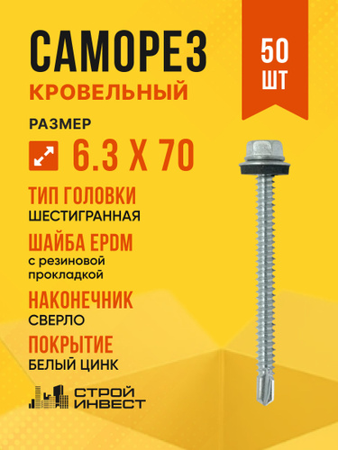 Саморез кровельный по металлу цинк 6,3х70 мм с EPDM шайбой, 50 шт