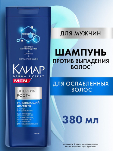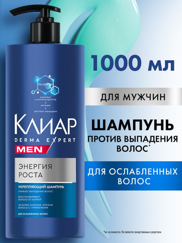 Клиар Men Шампунь мужской для волос, укрепляющий, Derma Expert Энергия роста, 1000 мл