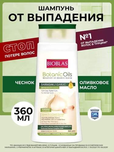 Bioblas Шампунь женский мужской ПРОТИВ ВЫПАДЕНИЯ ВОЛОС с экстрактом чеснока и оливковым маслом, аптечная косметика, 360 мл