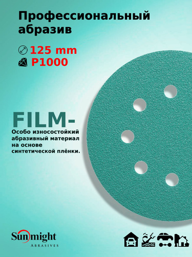 D-125; P1000; 5 шт. FILM, 8 отверстий. Шлифовальные круги на липучке SUNMIGHT: 125 мм; P1000; 5 шт.