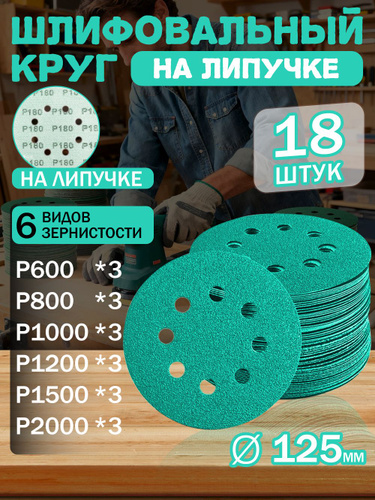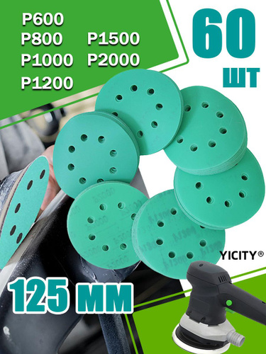 Набор шлифовальных кругов 125 мм на липучке / 60шт /Р600,P800,P1000,P1200,P1500,P2000; зеленый, самозацепляющийся с отверстиями