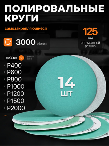 Круг шлифовальный, Диск шлифовальный на липучке 125 мм, Р400 Р600 Р800 Р1000 Р1200 Р1500 Р2000 по 2 шт., БАЗ 14 шт. Водостойкая.