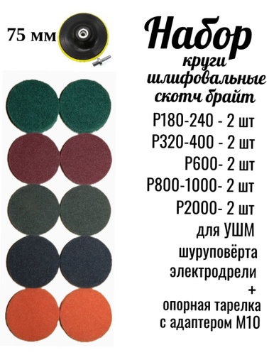 Круги шлифовальные, скотч-брайт P180-240, P320-400, P600, P800-1000, P2000 на липучке, 10 шт, опорная тарелка 75 мм с адаптером, набор