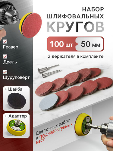 Шлифовальные круги 50 мм набор 100 шт, наждачные диски на липучке для гравера, дрели, шуруповёрта, шкурка для шлифовки и полировки, с держателеми и адаптероми