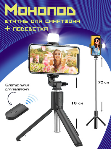 Штатив для телефона c лампой, Монопод трипод с Bluetooth пультом управления, Селфи палка для смартфона с Led подсветкой,