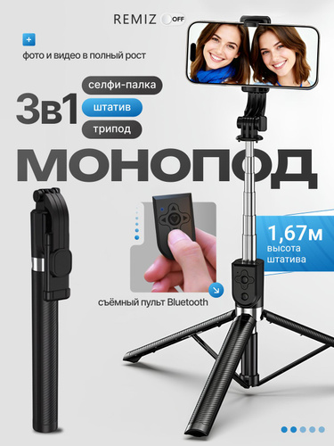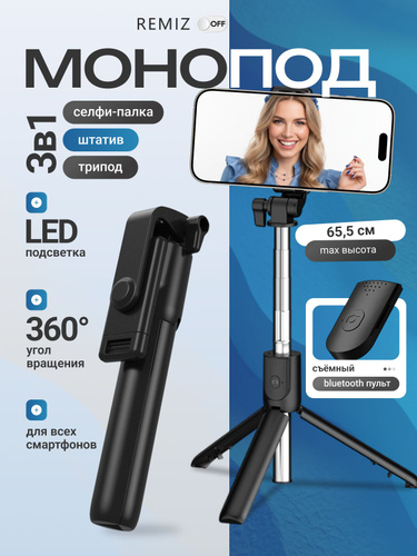 Штатив для телефона с Bluetooth пультом, Монопод-трипод R1S-Черный для селфи, встроенный ,селфи палка для смартфона