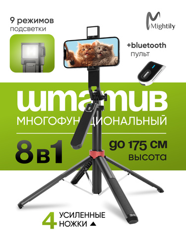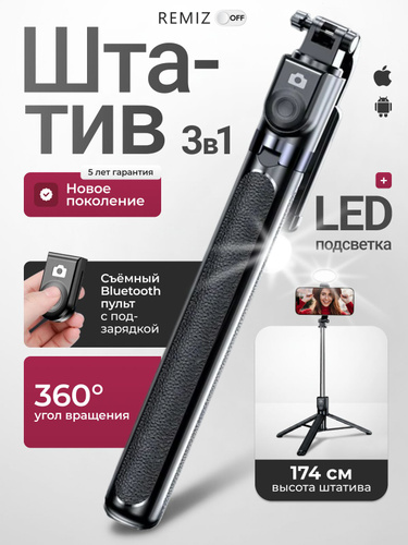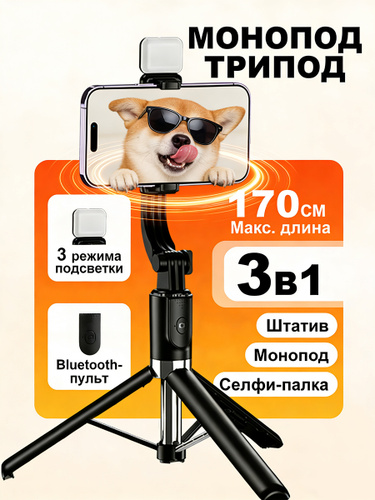 Штатив для телефона 170 см с LED-подсветкой, трипод монопод селфи-палка с Bluetooth пультом
