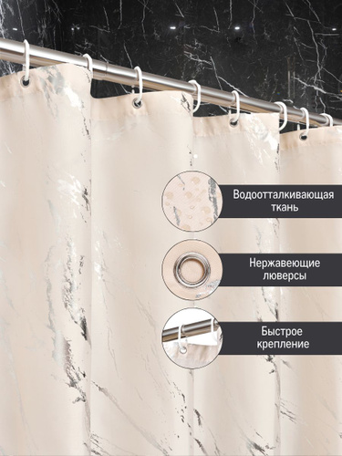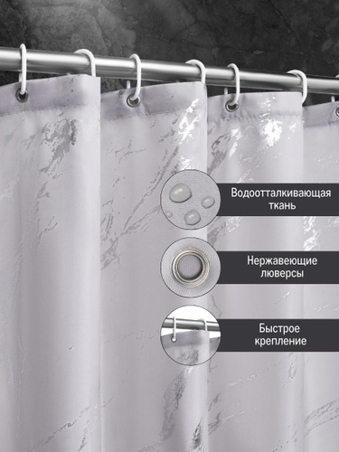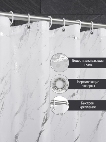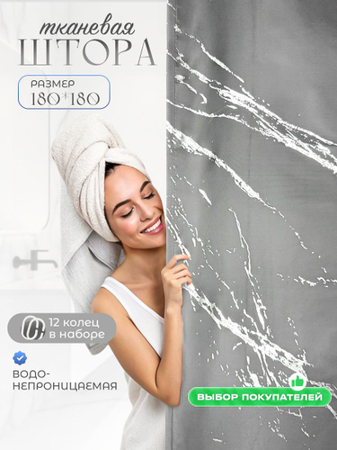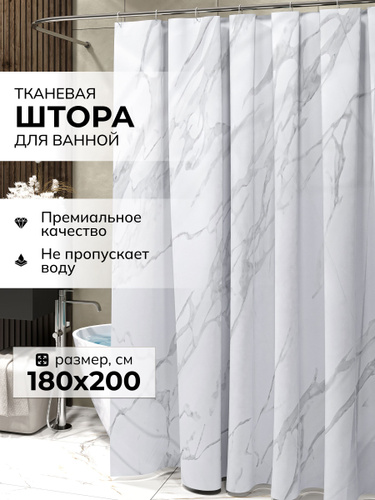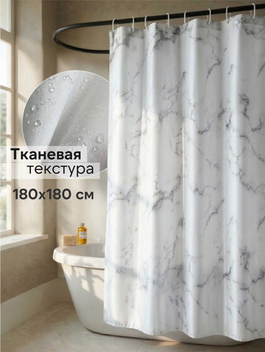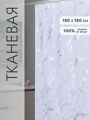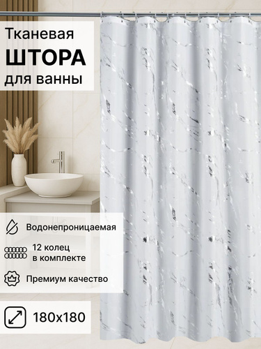 Шторка для ванной тканевая Мрамор 180*180 Defender, занавеска в ванную комнату с 12 кольцами