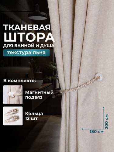 Штора для ванной 180х200см тканевая с крючками бежевая