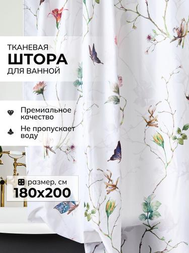 Штора для ванной тканевая водоотталкивающая, цветы и бабочки, высота 200 см, ширина 180 см