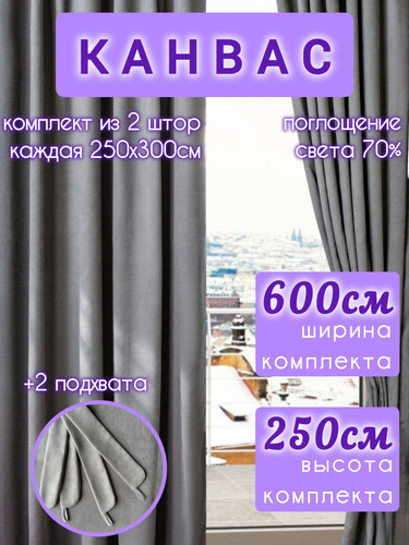 Шторы СЕРЫЕ комплект однотонные канвас 250*600 см для спальни, зала, гостиной, детской