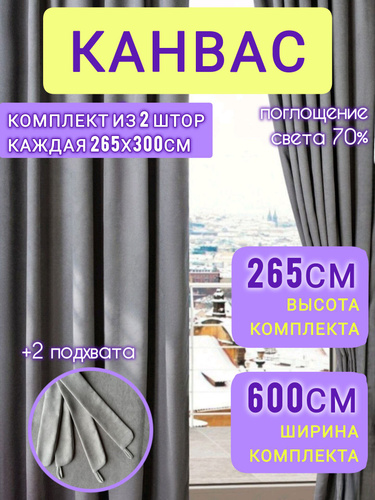 Шторы СЕРЫЕ комплект однотонные канвас 265*600 см для спальни, зала, гостиной, детской