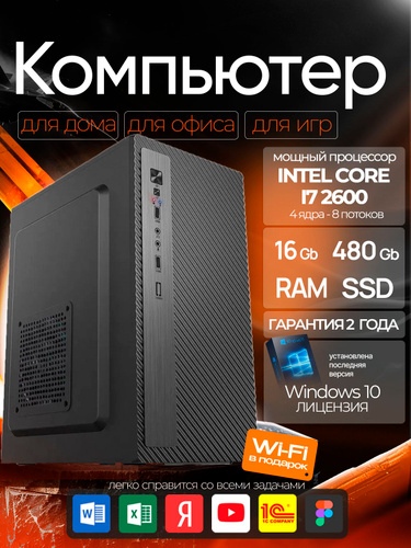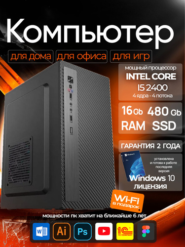 Системный блок Компьютер ПК (Intel Core i5-2400, RAM 16 ГБ, SSD 480 ГБ, Intel HD Graphics, Windows 10 Pro), черный, черный матовый