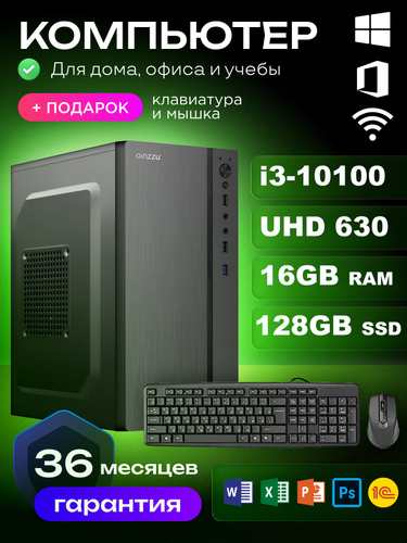 RIWER Системный блок (Intel Core i3-10100, RAM 16 ГБ, SSD 128 ГБ, Intel UHD Graphics 630, Windows 10 Home), черный матовый