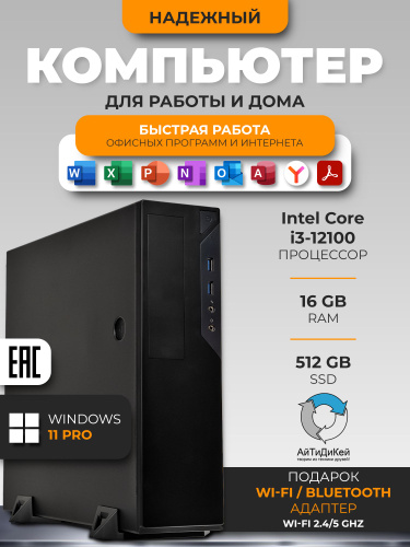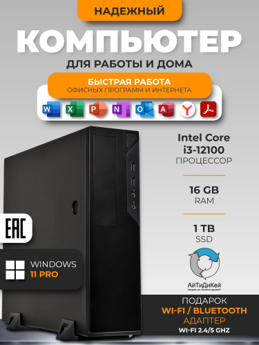 Системный блок (Intel Core i3-12100, RAM 16 ГБ, SSD 1024 ГБ, Intel UHD Graphics 730, Windows 11 Pro), черный