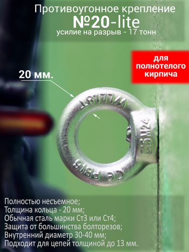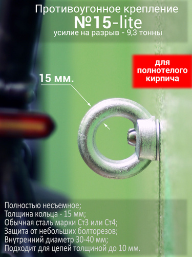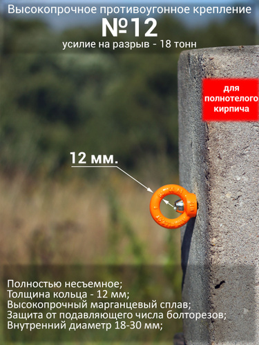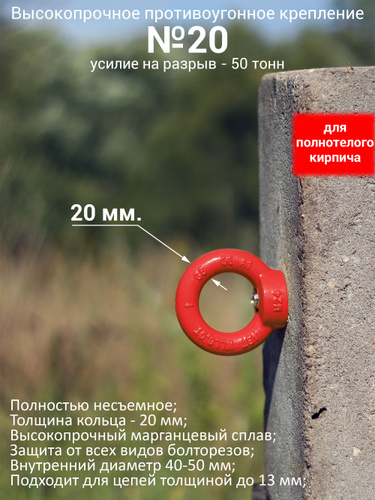 Крепление от угона велосипеда №20. Высокопрочная закаленная сталь. Марганцевый сплав. Только для полнотелого кирпича. Подходит к цепи с замком для велосипеда толщиной до 13 мм.