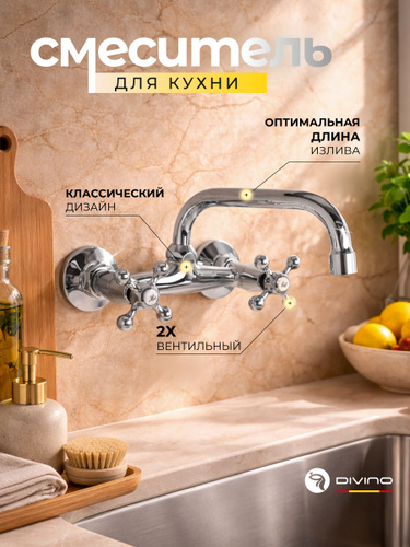 Смеситель / кран для кухни / С двумя ручками вентилями / Хром / DIVINO / Код 4255